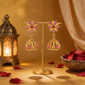 Pink Stone Floral with Intricate Cage Gold Earrings for Women