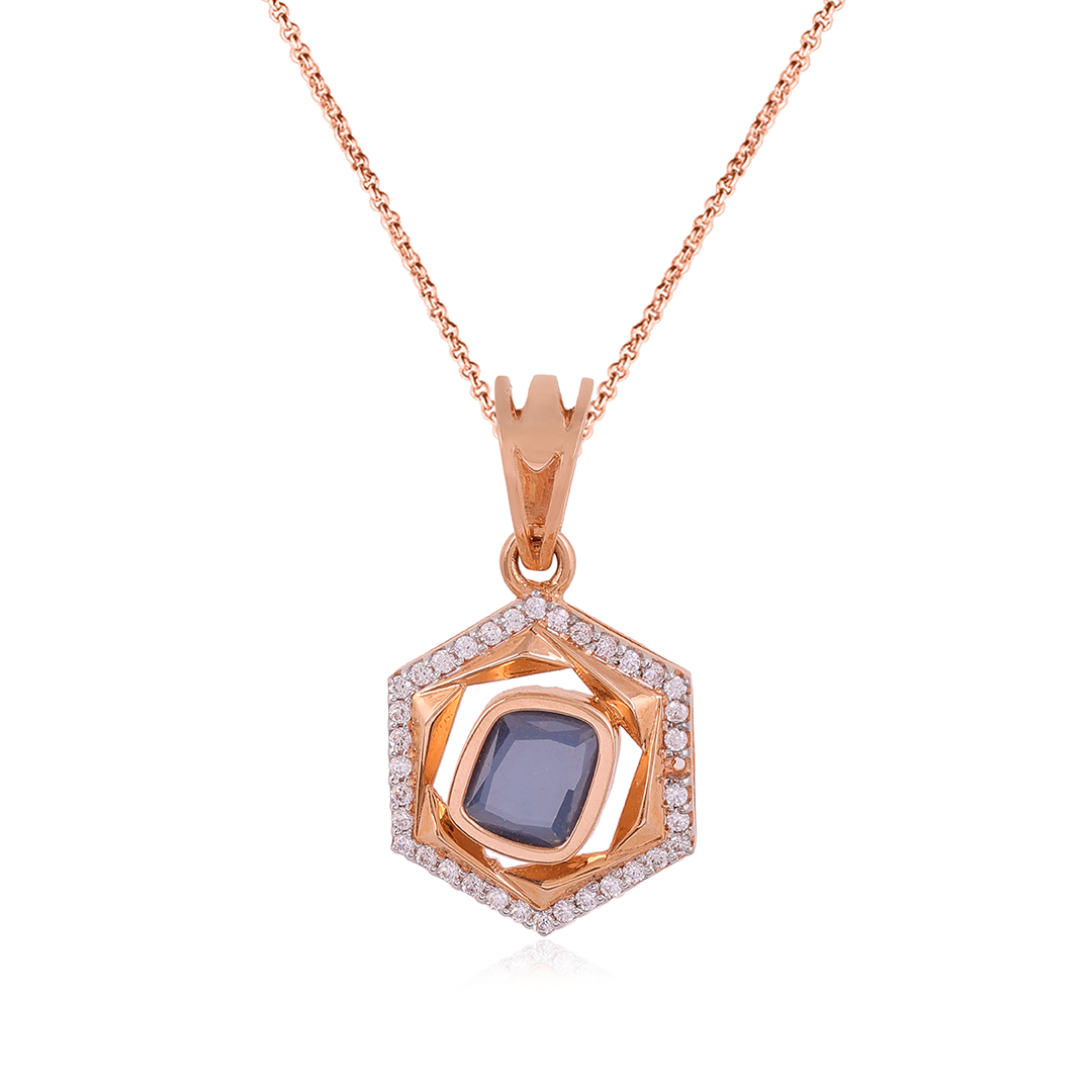 Add a bold and sophisticated touch to your collection with the 18 Karat Blue Penta Rose Gold Pendant Set. Crafted from high-quality 18 karat rose gold, this striking set features a unique pentagon (penta) design, highlighted by a vibrant blue gemstone that catches the light beautifully. The combination of the rich rose gold and the vivid blue creates a perfect contrast, offering a modern, chic look that’s perfect for both casual and formal occasions. Ideal for women who love to make a statement with their accessories, this pendant set adds a touch of luxury and elegance to any outfit.