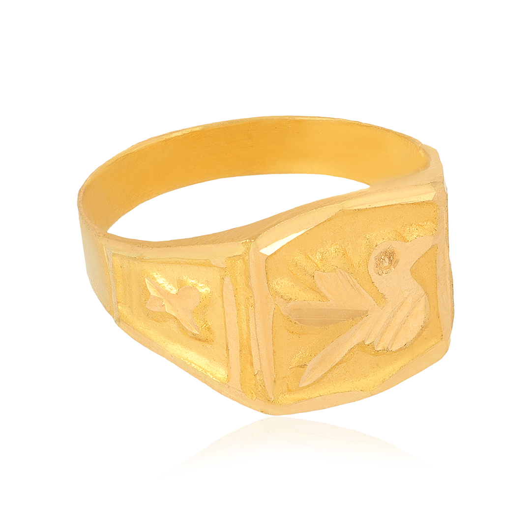 The Bird Print Box Gold Ring showcases a square-shaped band with intricate bird engravings, adding a nature-inspired touch to its bold geometric design. Crafted in polished 22 karat gold, this ring blends symbolism with modern style, making it a unique statement piece. Its distinctive charm enhances both casual and formal looks, offering a creative fusion of nature and geometry.