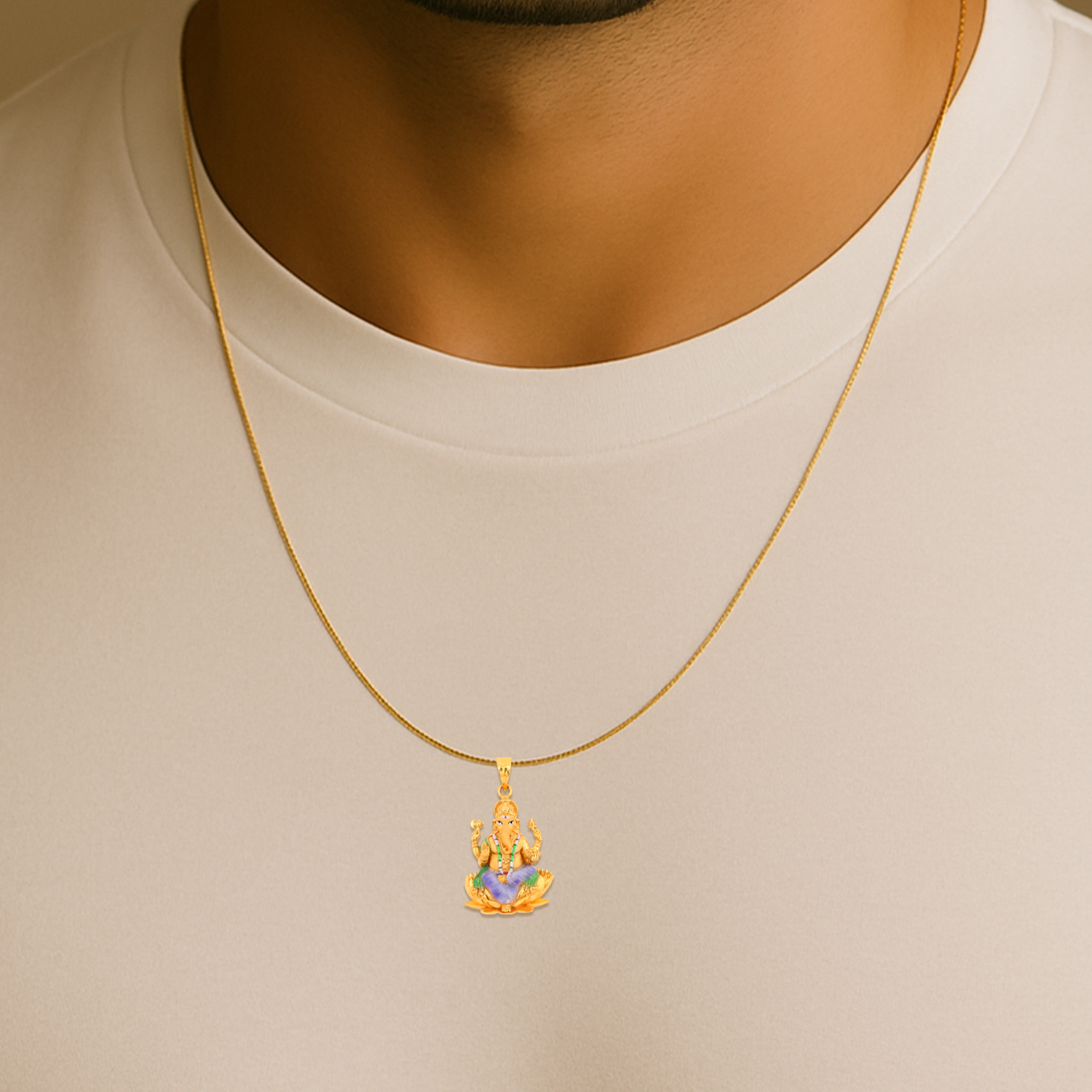22 Karat Yellow Gold Auspicious Ganesha Colorful Lotus Base Pendant for Men is a spiritually rich pendant crafted from radiant 22 karat yellow gold, featuring a detailed Ganesha motif seated on a vibrant lotus base with colorful enamel accents. Symbolizing wisdom, protection, and prosperity, it pairs beautifully with ethnic attire such as dhotis, kurtas, and bandhgalas for religious ceremonies or cultural events. This pendant is a powerful talisman that blends tradition with striking craftsmanship, making it a meaningful and elegant accessory for men.