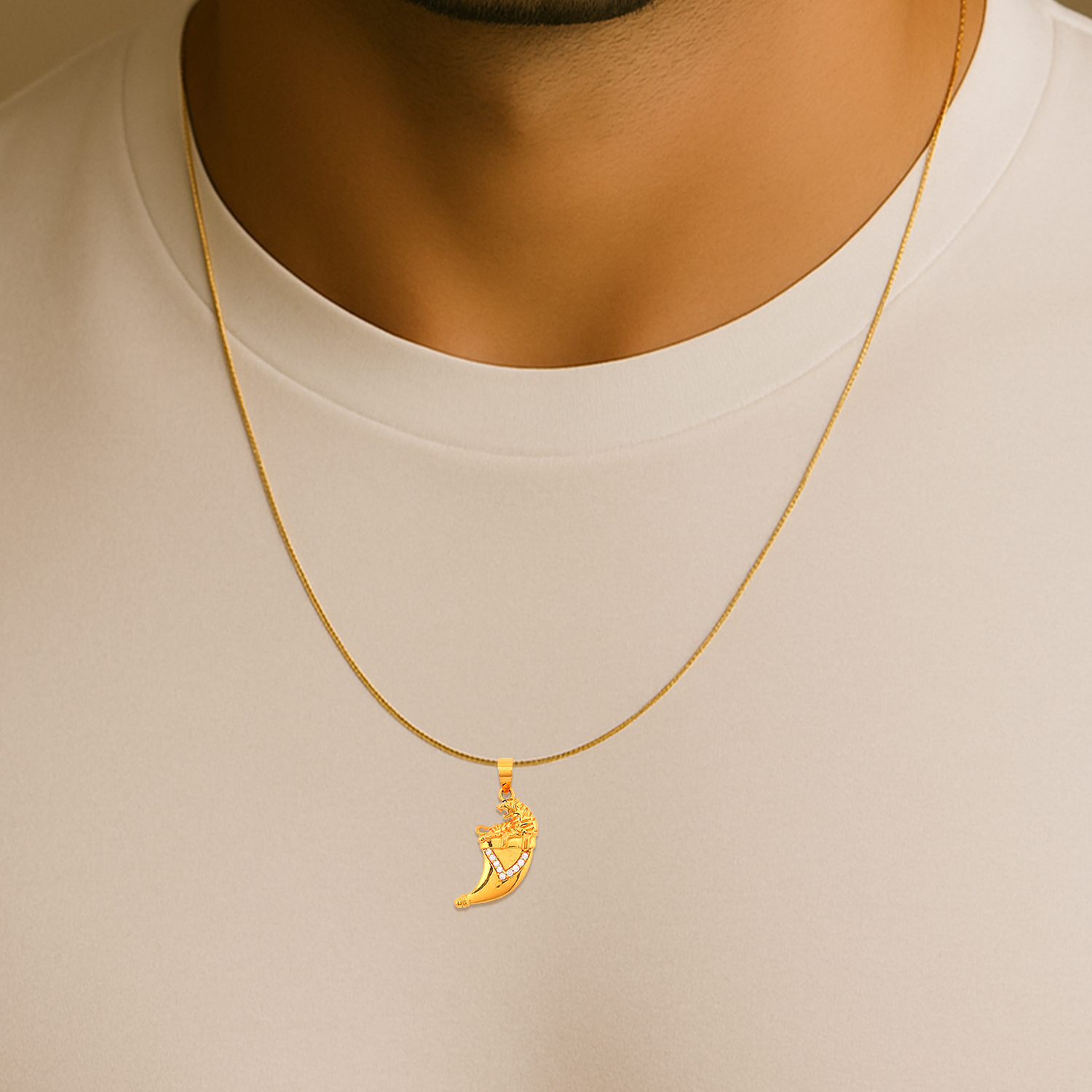 22KT Yellow Gold Ferocious Tiger Claw Diamond Studded Triangle Accent Pendant for Men is a bold and fierce accessory crafted from pure 22 karat yellow gold, featuring a striking tiger claw design embellished with sparkling diamond-studded triangular accents. This pendant symbolizes strength, power, and fearless spirit, making it perfect for pairing with edgy casual wear or sharp ethnic outfits like bandhgalas. Ideal for men who want to showcase confidence and individuality, it blends luxury with a daring attitude. A captivating statement piece that commands attention and exudes raw energy.