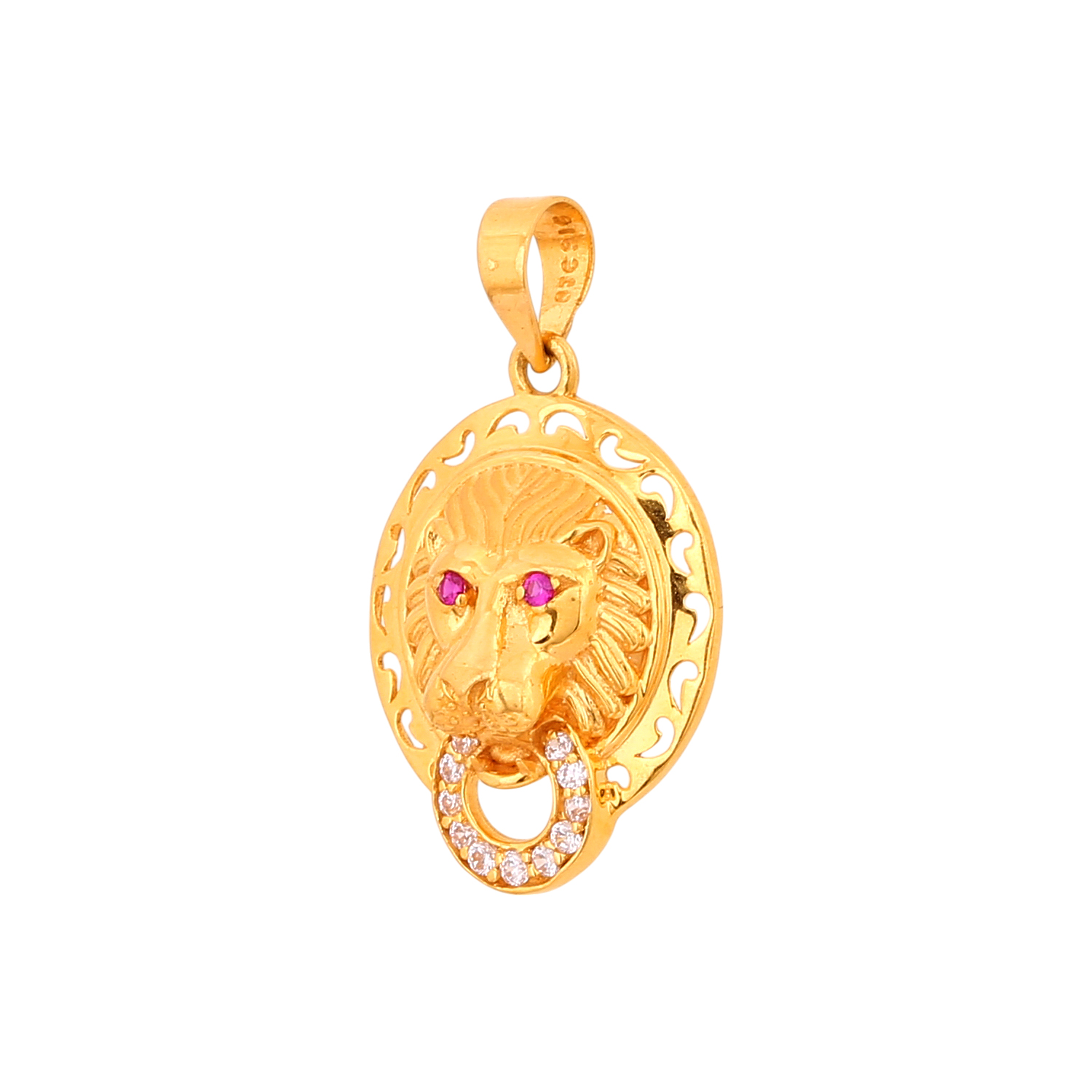 22KT Yellow Gold Regal Lion Head Pink Ruby Eyes Pendant for Men