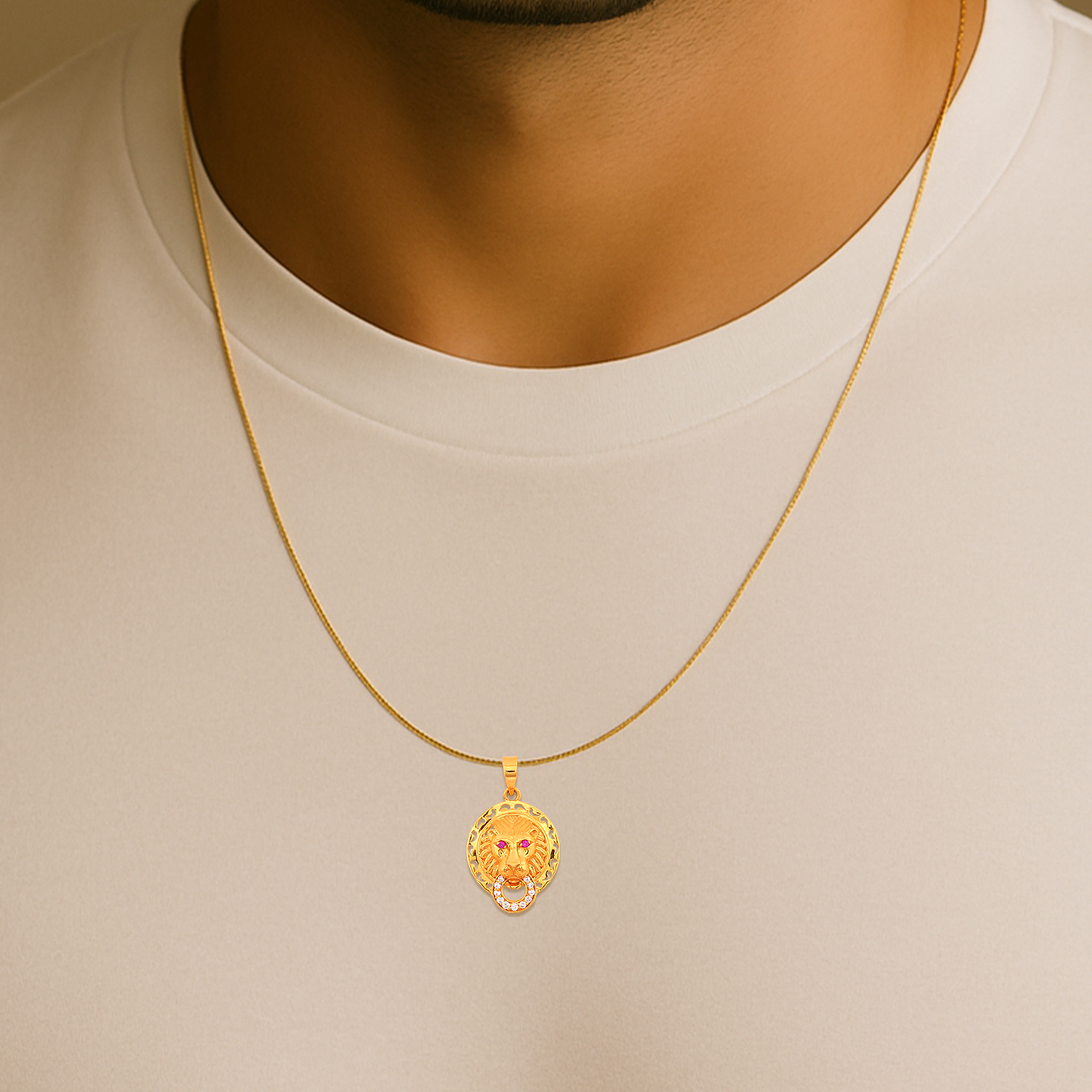 22KT Yellow Gold Regal Lion Head Pink Ruby Eyes Pendant for Men is a bold and majestic piece crafted in pure 22 karat yellow gold, featuring a detailed lion head design with striking pink ruby eyes. Symbolizing courage and royalty, this pendant pairs perfectly with ethnic sherwanis or contemporary formal wear, adding a fierce yet sophisticated edge. Ideal for men who want to make a powerful statement, it blends luxury with fearless style. A captivating accessory that commands attention and respect.