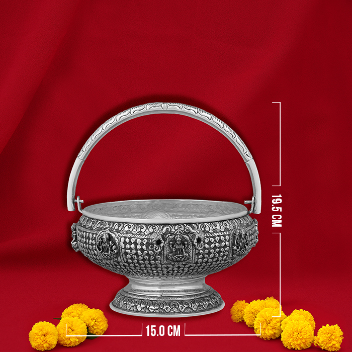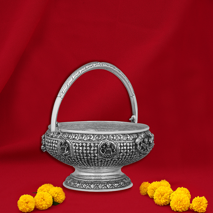 Astalakshmi Pooja Basket Silver Articles is a beautifully curated set of silver pooja items that represent the eight forms of Goddess Lakshmi, symbolizing prosperity, wealth, and well-being. This basket is perfect for offering during pooja rituals, bringing both spiritual significance and elegance to your celebrations. Made from high-quality silver, the articles in this basket combine traditional design with luxurious craftsmanship. Ideal for online shopping, it serves as a thoughtful and meaningful gift for religious occasions, corporate gifting, or personal milestones, adding divine blessings to any home or pooja space.