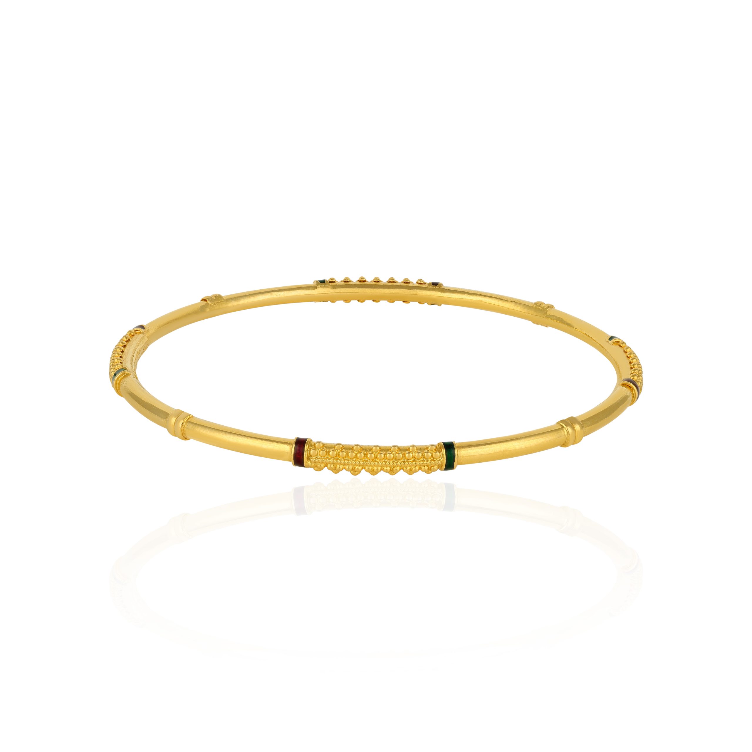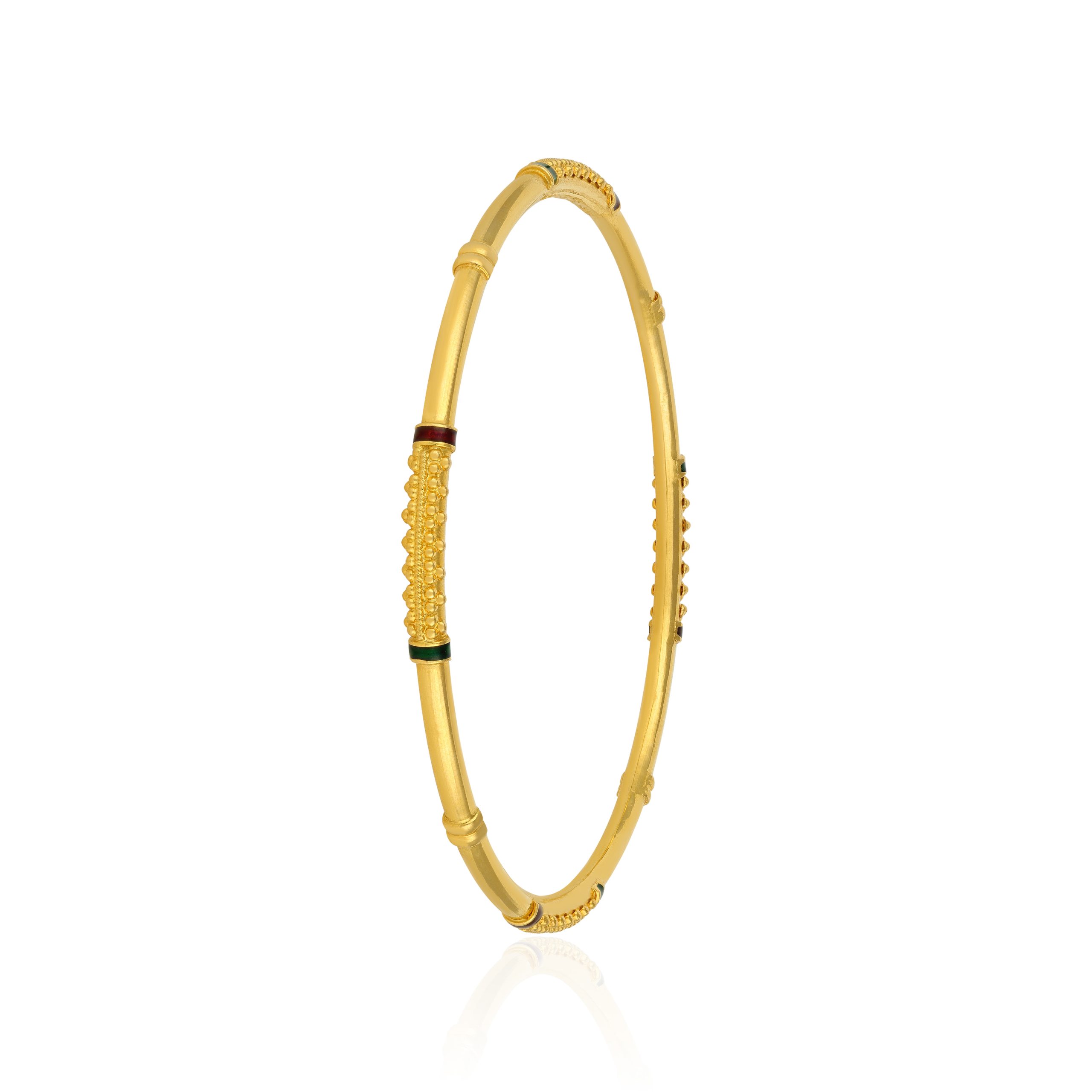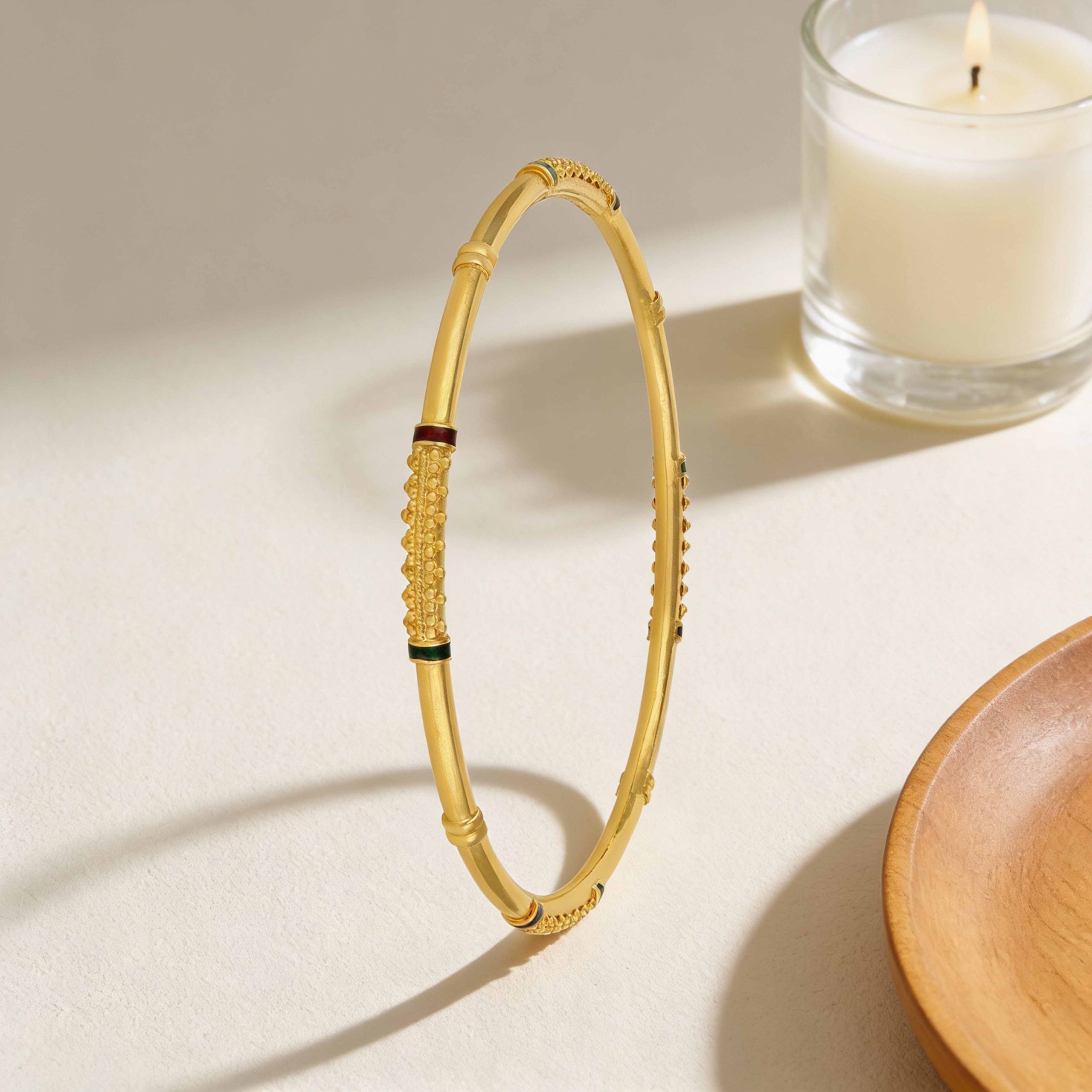 Heritage Tubular Ribbed Enamel Yellow Gold Bangle for Women is a striking blend of traditional artistry and timeless elegance. Crafted in radiant yellow gold, it features a tubular design with ribbed textures and subtle enamel accents, creating depth, color contrast, and heritage-inspired charm.