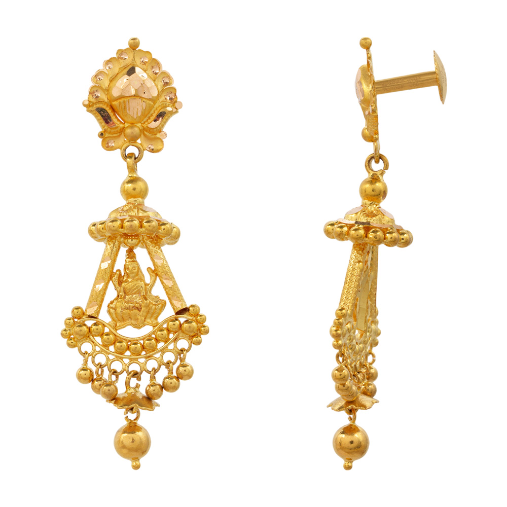 Introducing our Elite Lakshmi Gold Earrings, a stunning tribute to traditional elegance and cultural beauty. Crafted from high-quality gold, these exquisite earrings feature intricate Lakshmi motifs that symbolize prosperity and abundance. Perfect for special occasions and festive celebrations, their detailed craftsmanship and radiant shine make them a standout accessory. Lightweight and comfortable, the Elite Lakshmi Gold Earrings are a timeless addition to your jewelry collection, bringing grace and sophistication to any outfit.