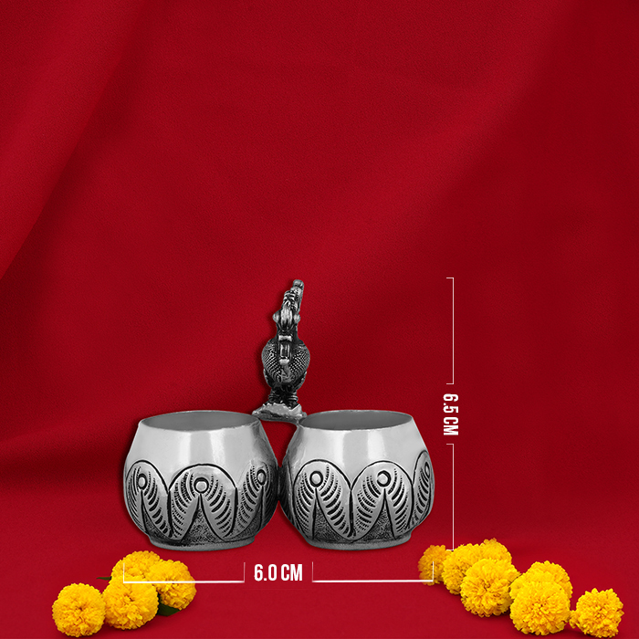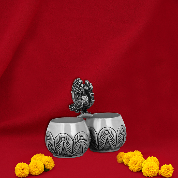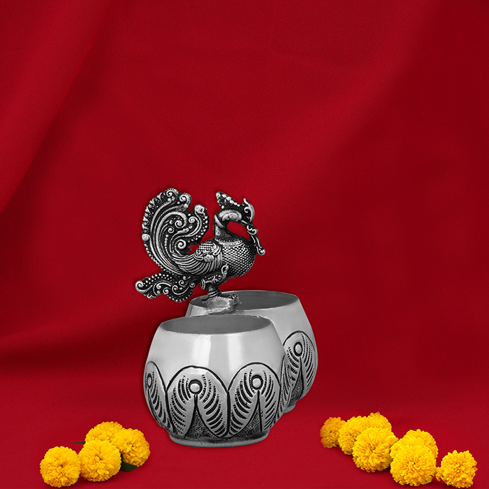 Peacock Centered Panchakinnam Antique Silver Articles For Pooja is a beautifully crafted set made from high-quality antique silver, featuring a stunning peacock design at the center. This panchakinnam (set of five traditional oil lamps) is ideal for pooja ceremonies, symbolizing prosperity, grace, and divine blessings. The antique finish adds a classic charm, making it a luxurious addition to any sacred space. Perfect for corporate gifting, religious occasions, or personal milestones, these antique silver articles enhance the spiritual ambiance while offering a meaningful touch to your pooja rituals.